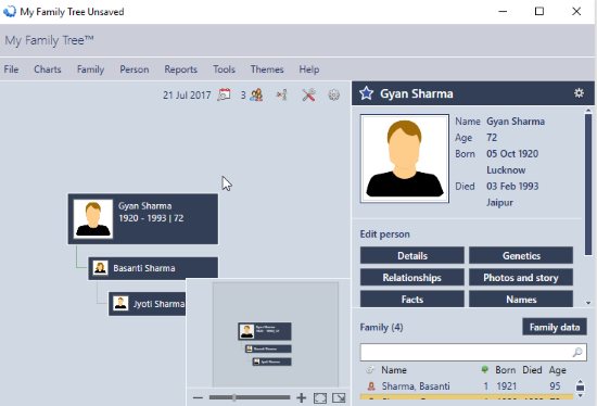 Add date of birth, date of death, place of birth, etc. fields, after that you can go ahead and add siblings in the same way. Then you can add spouse, kids, details in the app as well. As you keep entering data the family tree will start shaping up for you, as can be seen in the screenshot above.