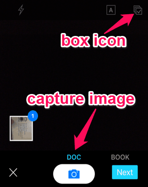 Step 2: It will offer you the built-in camera to take an image of the document. At the top right corner of the camera, you will see a “Box” icon. When you enable the icon, it will ask you to capture 3 images among which it will fetch the best one automatically.