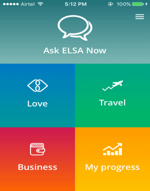 Step 2: Once you’re in, you’ll see 5 different options named, Ask ELSA Now, Love, Travel, Business, and My Progress. The Love, Travel, and Business options are actually lessons with multiple levels of practice words and sentences.