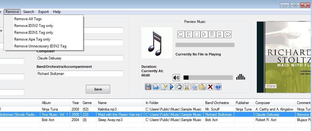 If your music has wrong ID3 information, you can remove it by clicking on Remove from the menu and selecting Remove All Tags, or any of the other options if you want to remove information selectively. Album cover art can also be downloaded from the Internet.