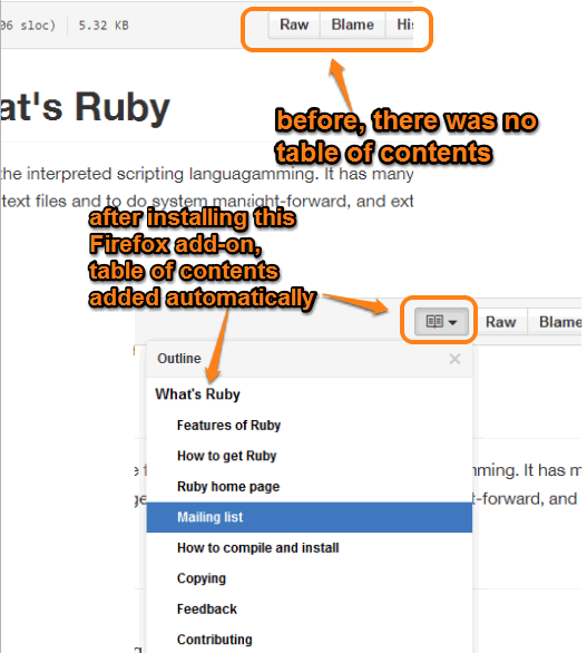 This Firefox add-on is surely handy when you are reading a long readme file of a GitHub project. The table of contents is generated automatically that you can use to open only the information you want to access.