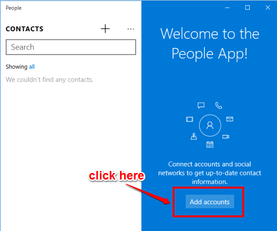 Step 2: Interface of People app has two different sections. The left section comes with “+” button to manually add a single contact. It will be time-consuming. So, we will use the ‘Right section’. In that section, you will see Add accounts button. Click it.