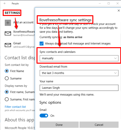 Step 4: This step is useful when you want to change the sync settings of Gmail contacts. You can access Settings (three dots icon) → then click on the added Gmail account → change mailbox sync settings → access Sync contacts and calendars drop down menu . After that, you can set syncing after every 15 mins, 30 mins, hourly, every 2 hours, or manually.