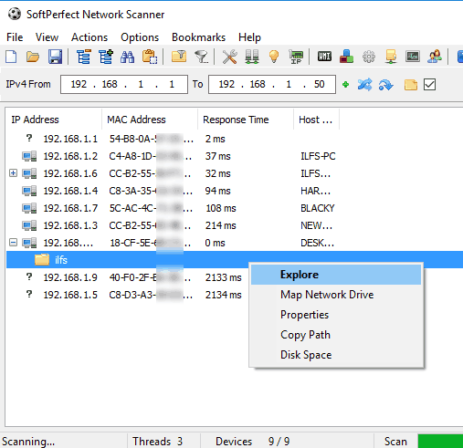 Using this software is also very easy. All you have to do is specify the ‘From’ and ‘To’ range of IP addresses for scanning. Once the scanning is completed, you can see the IP addresses of other users, shared folders of your and other users, MAC Addresses, etc.