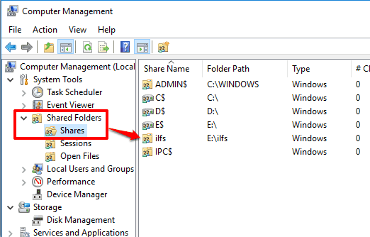 Step 2: Computer Management window includes Shared Folders section. Clicking on that section will explore its sub-sections. Now you can click on ‘Shares‘ to see the list of shared folders in your Windows 10 PC. You will also be able to see the Folder Path, Type, the number of clients connected to folders, etc. Moreover, you can also right-click on any folder to stop sharing.