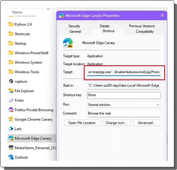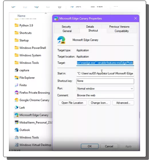 - Explorer will open now, and you will see the Edge Canary’s shortcut file. Right click on it and then open the properties.