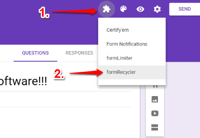 Step 3: After installing the add-on, you can use a blank Google Forms document or open an existing Google Form. After that, click on Add-ons icon and you will see “formRecycler” option. Select that option.