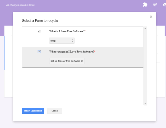 This tutorial explains how to reuse questions from a Google Form in another Google Form. You can select a particular Google Form from the list of available forms stored in your Google Drive and then import questions of the selected Google Form. The best part is you will have the choice to reuse all questions or only selected questions from that particular Google Form. This is handy when you want to create a new Google Form or edit an existing Google Form and want to use all or some questions of a saved Google Form.
