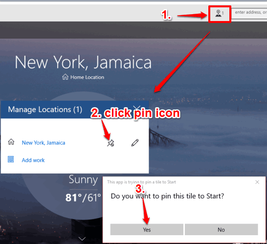 Step 2: After opening the app, search a location for which you want to show weather forecasts on the Start menu. After adding the location, click the Pin icon visible on the top of this app. A pop-up will open for the confirmation. You can press Yes button and the weather tile for that city will be pinned to Start menu.