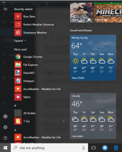 Option 3: Display Weather Forecast for A City In Windows 10 Start Menu Using Free AccuWeather App