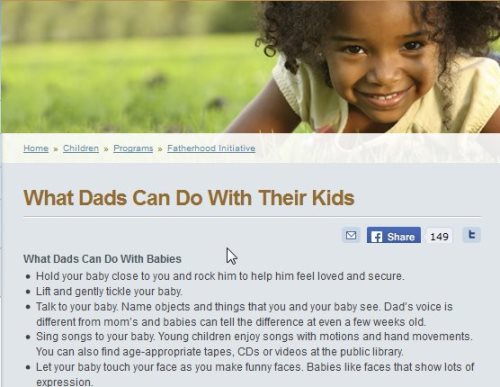 The website has a entire section dedicated to children. Where under programs you will find a fatherhood initiative section with a detailed list of activities that fathers can do with their children. You can find activities for all age groups like infants, toddlers, 4-6 year olds, 7-12 year olds, and teenagers. We are talking about toddlers today, so under that section there are various activities listed. To name a few like reading, potty training, catching a ball, teaching small words, etc.