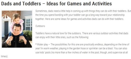 This website is a informative guide for parents with some good articles on common parenting concerns like child behavior, reading skills, motivating, developing skills, etc. Amongst all this they also have a good article on how dad’s and toddlers can bond with different games and activities. The activities are divided into 2 categories indoor games and outdoor games. Outdoor activities include things like water play, going to playgrounds and parks, etc. Indoor activities include activities like reading story books, several games like follow the leader, joining the blocks, etc.