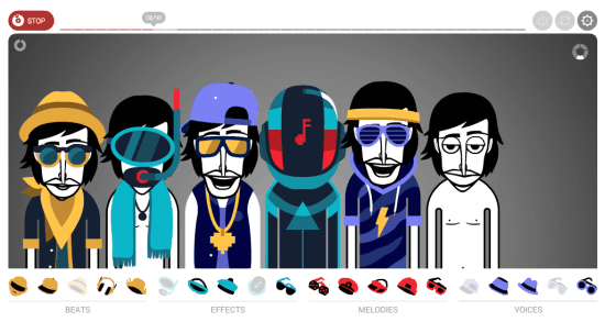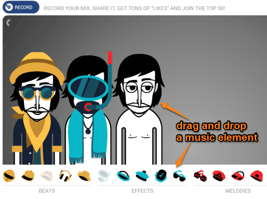 Above you can see the beats, melodies, and voices that are available in forms of hats and goggles. You need to drop those musical elements to a character and then the dropped elements can be played and recorded by you. So making the music remix is really interesting in this website.
