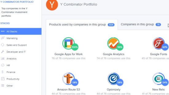 - Y Combinator Portfolio: Companies in the Y Combinator investment portfolio are listed here along with the tools being used across these companies. Some popular companies in this group are 9GAG, Airbnb, Codecademy, Dropbox, Instacart, Product Hunt, Weebly, Zesty, etc. Some tools being used by these companies are Google Analytics, WordPress, CloudFlare, Google Tag Manager, MailChimp, Slack, Gusto, Trello, Tumblr, etc.