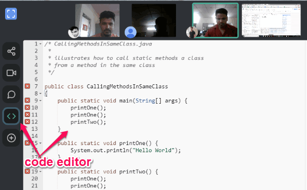 After you enable the shared code editor (CodePad) by clicking on the “+” button, you can see a new tab on the left panel. Now, when you click on the “CodePad” tab, a blank code editor will appear and you can start coding or discuss code with the participants. They can also contribute if they want.