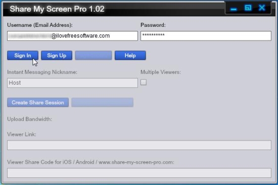 After installation when you launch the software, you will have to enter your login credentials to sign in to Share My Screen Pro.
