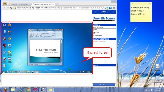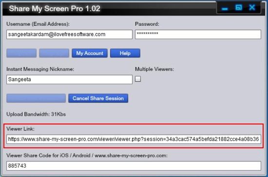 Share My Screen Pro is quite simple. Though it provide features like online screen sharing with audio support and instant messaging, however, it doesn’t allow other people to have a remote control on your PC, something which another free online screen sharing tool Quick Screen Share provides. Also, you can not have an online conference of more than two people (unless you upgrade to the paid version), which is also a useful feature offered free of cost by many of its competitor service like Join.me.