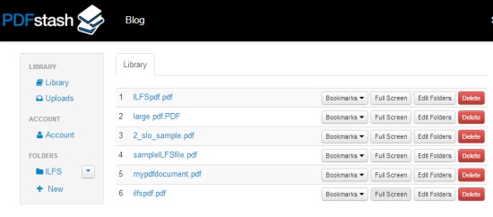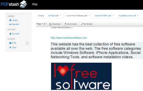 PDFstash is an online pdf viewer that allows to upload pdf files so that you can access your important pdf documents from anywhere. It lets you store pdf documents on your PDFstash account and allows to read them as well as bookmark any page of pdf document. Bookmarking a pdf document is helpful to directly access a page from where you left. You can also download the uploaded document or can view it online in full screen mode.
