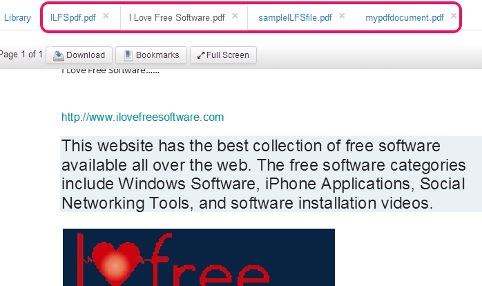 Click on any pdf to read it with built-in pdf viewer. Multiple documents can be opened together in separate tabs, like visible in screenshot below. Moreover, you can download or bookmark any page of pdf document to access it directly from library.