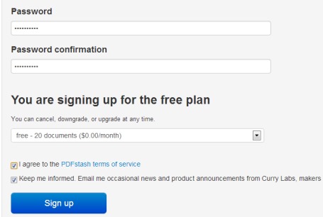 To use this free version of PDFstash and to import pdf documents, you need to create a free account. Access its homepage link and sign up by providing your name, email address, password, Twitter username (to upload pdf files using web link from your Twitter account), select free plan, and create your account.