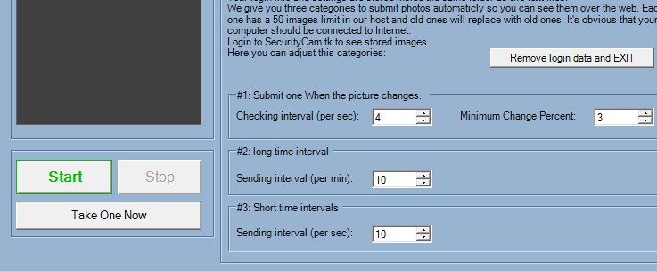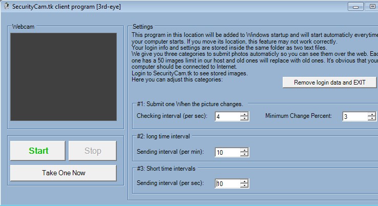 Select how often you want SecurityCam to take photos with your web camera, how much of a difference there must be between the photos in order for them to be taken and all the other options. When you’re done click on the Start button. This will activate SecurityCam, it’s gonna work in the background photos, and upload online.