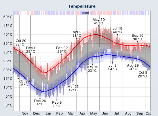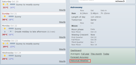 Click on ‘Historic Weather’ link and you will be taken to a new webpage showing the past 12 months climate history of your selected city. You may also opt for the ‘Forecast Accuracy’ link to compare the validity of predictions done previously.