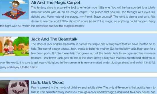 This website has a good collection of animated stories for kids. The website is also pretty colorful to look at. Apart from stories there are many other activities for the kids. When you go to the animated stories page, you will see a list of stories you can choose from. When you click on a story name, it will open up in a new page. There will be a short summary of the story and at the end will be a button to watch this animated story. When you click this button, a new tab will open up with the animated story being played in it. The website plays the videos from different websites and doesn’t store anything on its website.