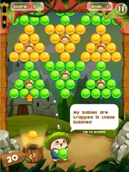 You can see mummy mushroom in the above screenshot asking for help. She has different colored balls which can be shot at groups of same colored bubbles to make them pop.