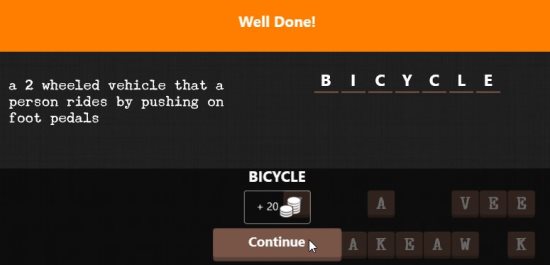 Read the sentence, and guess the word which will represent it properly. Now fill in the blanks using the random letters given at the bottom right of the screen. When you fill in your answer and it is correct a screen like the one shown below will come up.