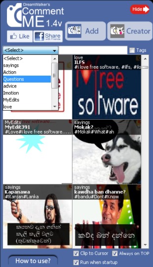 After completing the registration, you can use it to create photo comments. It will remain hidden at the right side on your desktop screen until you click on its camera icon to display it. After clicking on the camera icon, its interface provides photo comments library, just like the screenshot below. Here, you will find plenty of photo comments in multiple categories. But one of the disappointing part is that most of the photo comments are in Sinhala language. So it will be of no use for English users.