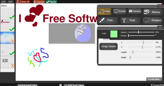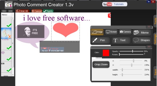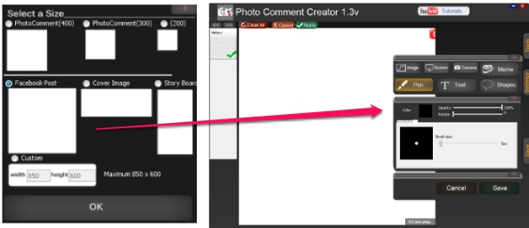 On Photo Comment Creator window, you can insert image from PC, and can add preset meme, shape, can use pen tool, text tool to create a photo comment just like the way you want.