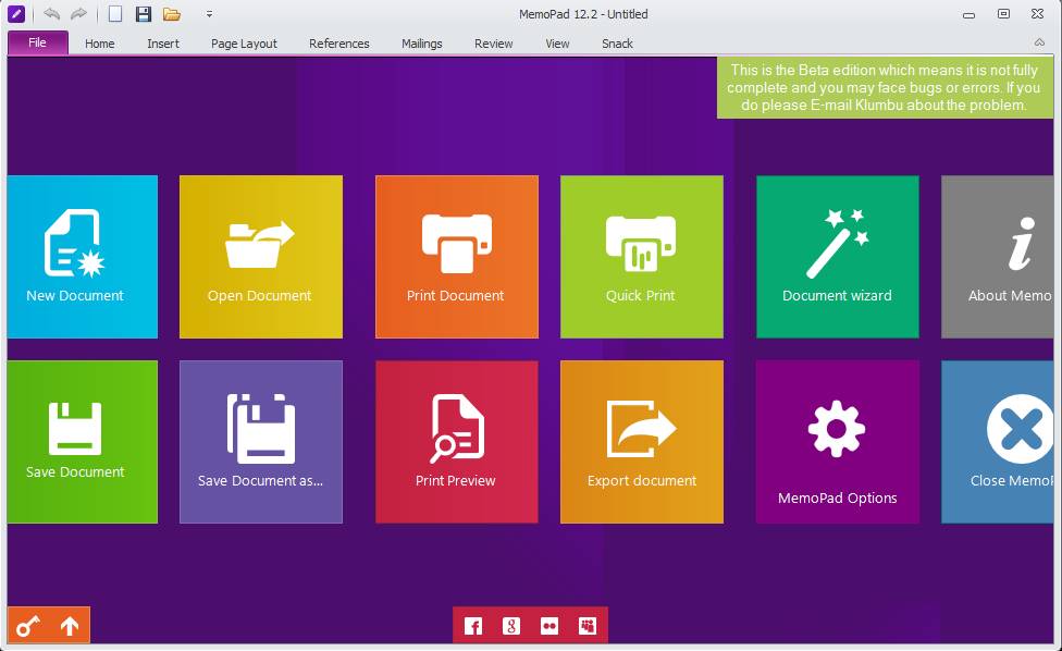 Like we said when you start the application, you will see the New Windows 8 style UI. Tiles are representing each one of the options and when you hover your mouse over them, arrows on the side should appear so you can slide over to hidden entries. Some options are available down below at the bottom where you can access social networks to share created documents with the people you know.