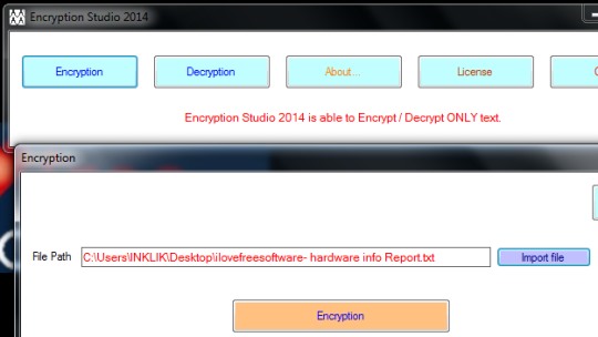 But unlike most of the other file encryption software, it cannot protect other files, like images, executable files, music files, etc. It is specially designed to protect text files only. Another shortcoming about Encryption Studio 2014 is that you cannot lock interface with password. So, if someone will access Encryption Studio 2014, then he/she can easily access your encrypted file.