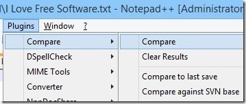 Compare is a very nice plugin for Notepad++. It adds file comparison feature directly to Notepad++, so that you don’t have to use any other stand-alone file comparison software. It is simple to use, simple to install, and completely free. My favorite feature in this is “Compare To Last Save”, as it lets me compare file with last saved version, without a need at my end to save versions.