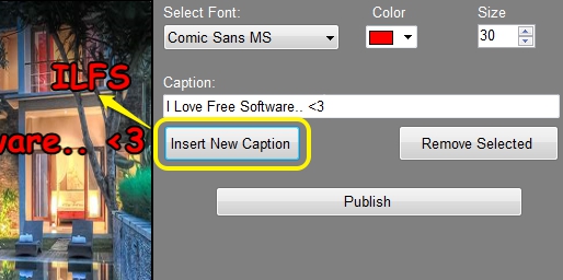 After adding the image, you can give it a caption. Write any text that comes to your mind and customize it by selecting any font style, font color, and size. After preparing a caption, hit the Insert New Caption button and it will be visible on the image.
