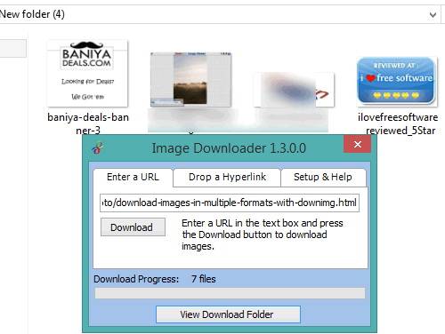 It is a portable software and comes in a zip file (around 2 MB). You can choose a custom folder to store the images. It can be used to download all kind of images (say GIF, PNG, JPG, etc.), Unfortunately, it downloads only the first frame of animated GIF file.