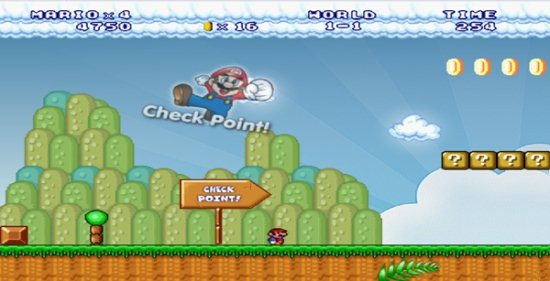 There are three difficulty levels in this Game. You can collect powers and coins hidden in walls and question mark boxes. Collect coins to increase your number of life’s and certain bonuses are also available. You have to kill small bugs, ducks etc. by stamping them or by firing bullets at them. Some stages have hidden levels also through pipes and bricks. The best option in this version is SAVE and Check Point’s are available. The game has time limit and that time is sufficient to cross the stage. At the end of every stage you have to jump high on to a flag pole. The higher you jump the more points you get and the remaining time will be added to your score.