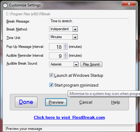 RestBreak is an efficient software which can help you to improve your health. Taking periodic breaks between continuous PC hours is critical to maintain health. Many a times a Reminder is what we need to get reminded of the possible consequences. RestBreak provides you that reminder. It’s certainly worth going for, if you are forever positioned on your PC.
