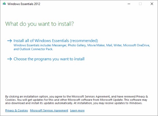 Once the file is downloaded, simply run it to install the Windows Essentials on your PC. When you run this file, it asks you to choose what you want to install. Since not all programs are working so, select the second option that allows you to choose the programs you want to install.