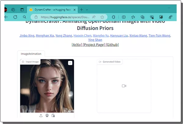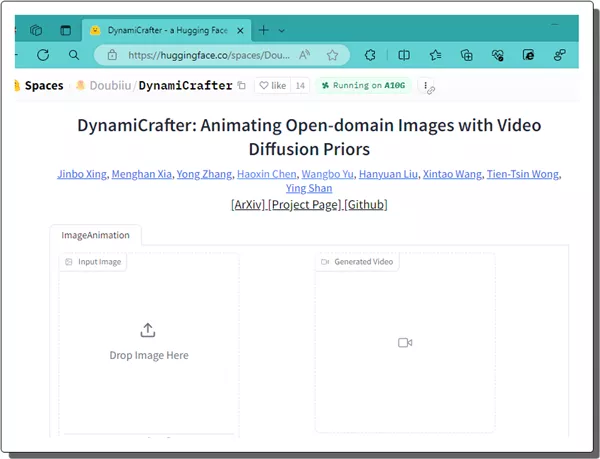 You can try this Hugging Face Space to use DynamicCrafter. Or, if you have a capable server then you can also self-host it as well. This is completely open source along with the AI model itself. The main interface of this on Hugging Face looks like this.