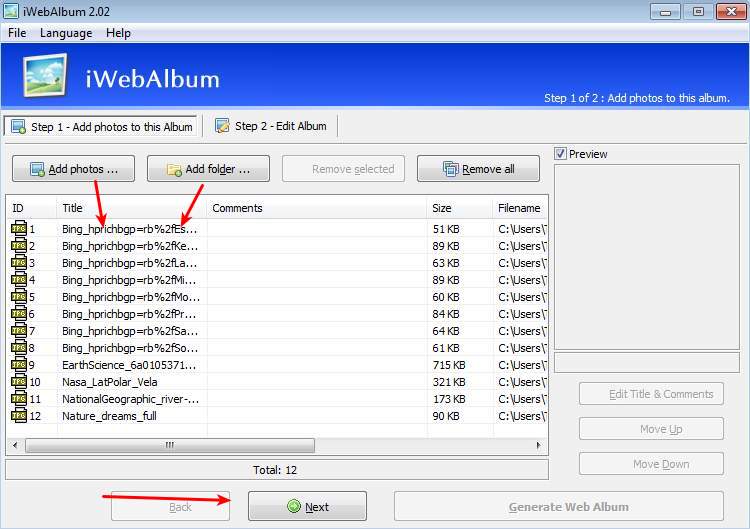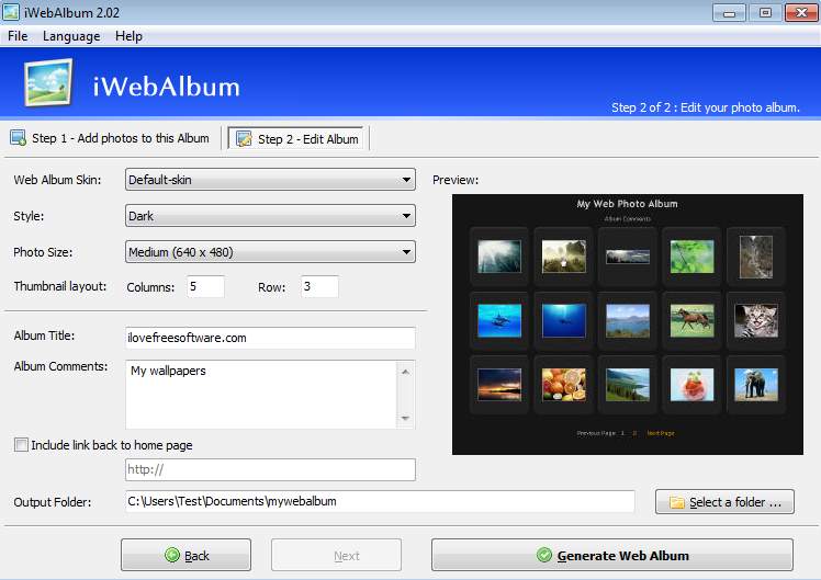 You can choose how large the album will be by specifying the size of the images used changing the number of rows and columns used. After you’re done with that simple step, add the name of the album and a comment, which will be shown below the name and you can click on the Generate Web Album button.