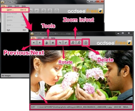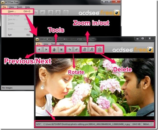 To use this rapid photo viewer, you need to click on the “File” and then select the desired image from the folder that you wish to view. As soon as you do that, it traces all the images in that folder and shows you the selected image in its window. At the same time it displays the total number of images present in that folder, location of the file along with its file format, and the size of the image. All this information is being displayed in the gray bar located at the bottom of the screen. The menu bar offers you previous/next buttons, tools buttons, rotate buttons, zoom in/out buttons and delete button.