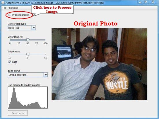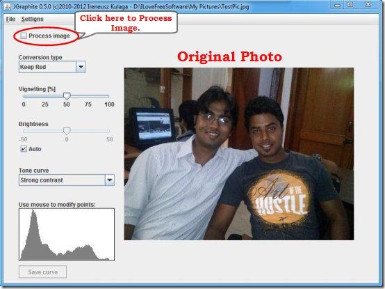 Then you can try out various image filters from the conversion type dropdown and select the desired one. You can also apply various tone curves to adjust the contrast of the image. JGraphite also provides two sliding bars to adjust picture’s brightness levels and to apply vignetting effects to the image. Vignetting is basically a photographic effect that results when the light reaches more to the center than the edges of the image. To know more about vignetting, you can refer the Wikipedia article here.