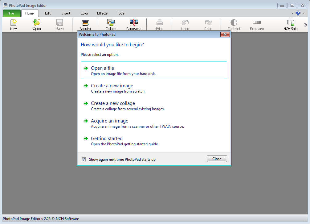 Small welcome window waits for you when you open up PhotoPad for the first time, it can be seen on the image above. There you’re gonna be able to select basic functions, like opening new images, creating collages or loading new images using your scanner, if you happen to have one. Some of the more interesting features offered by this free image editor would be: