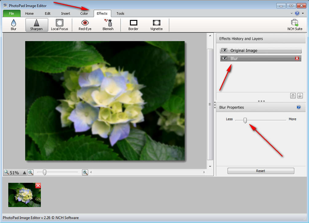 - Effects – blur, sharpen, local focus, red eye removal, blemish, border, vignette