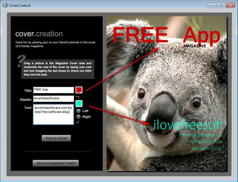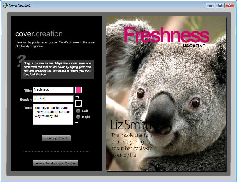 First step in creating your very own fake magazine cover would be to replace the default image of the pretty lady. We’ve decided to go with a koala, and we’ve added it by simply dragging and dropping it onto the Cover Creator work area. Image was automatically positioned with the koala in the center of the screen, which might mean that Magazine Cover Creator comes with automatic image alignment, but it could also just be a coincidence.