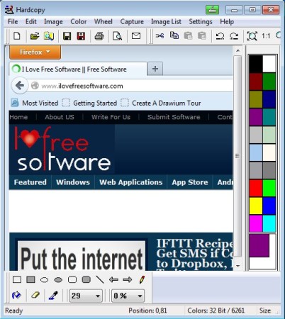 Screenshot above shows Hardcopy in action. As you can see, not only that you get the very useful feature of direct screenshot printing, there’s also image editor where you can edit created screenshots. Toolbar with various image editing tools is available at the top, color pallet on the right, while the rest of the interface is reserved for screenshot previews. There’s three types of screenshots that you can create, entire desktop, rectangular sections and of course application windows. Key features of Hardcopy – free screenshot utility are: