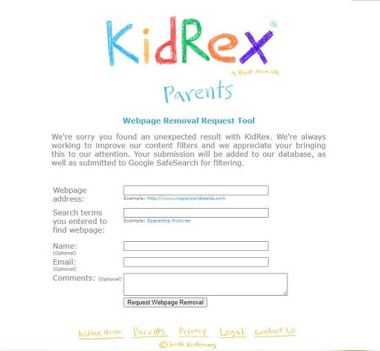 - If you still find some content that is objectionable, on the KidRex Home Page, click on ‘Parents’ -> ‘Web Removal Request Tool’, fill in the details in the form to inform the developers of the unexpected and objectionable results