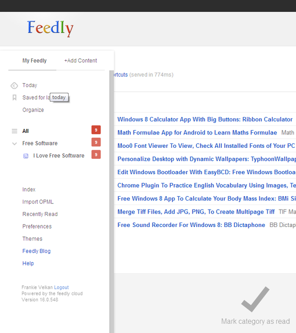 Screenshot down below shows us how Feedly is gonna look like after you install this free Feedly to Google Reader converter extension to your Chrome. Notice the very familiar Google logo style, which now spells Feedly. Rest of the interface follows the same design that Google and Google Reader had.