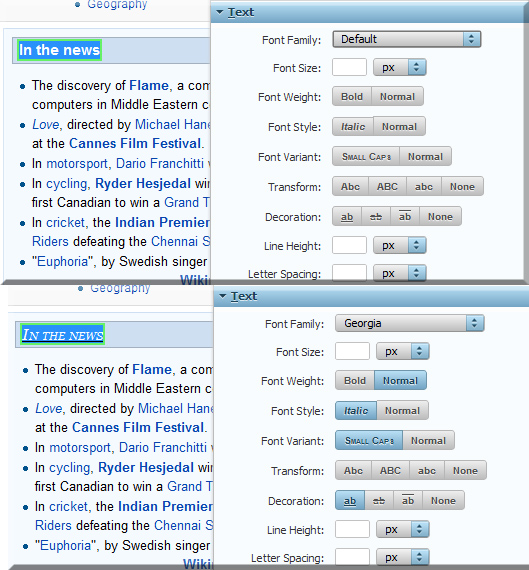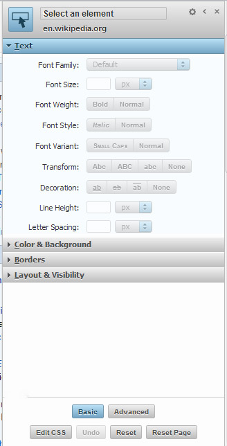 The interface is very simple. When a page allows usage of the extension, the CSS icon can be clicked to activate the extension. When that is done, the extension figures out which of the elements on the webpage can be modified and highlights them using a green box. The various modifications that are available include modifications to text, color, background properties, borders, etc. It even includes an option that lets the user hide certain elements on the page. This can come in particularly handy at times. The modification comes in two flavors. The above mentioned properties can be viewed in ‘Basic’ mode. In ‘Advanced mode’, which is meant for advanced users, the user can modify the CSS code itself to add more functionality.